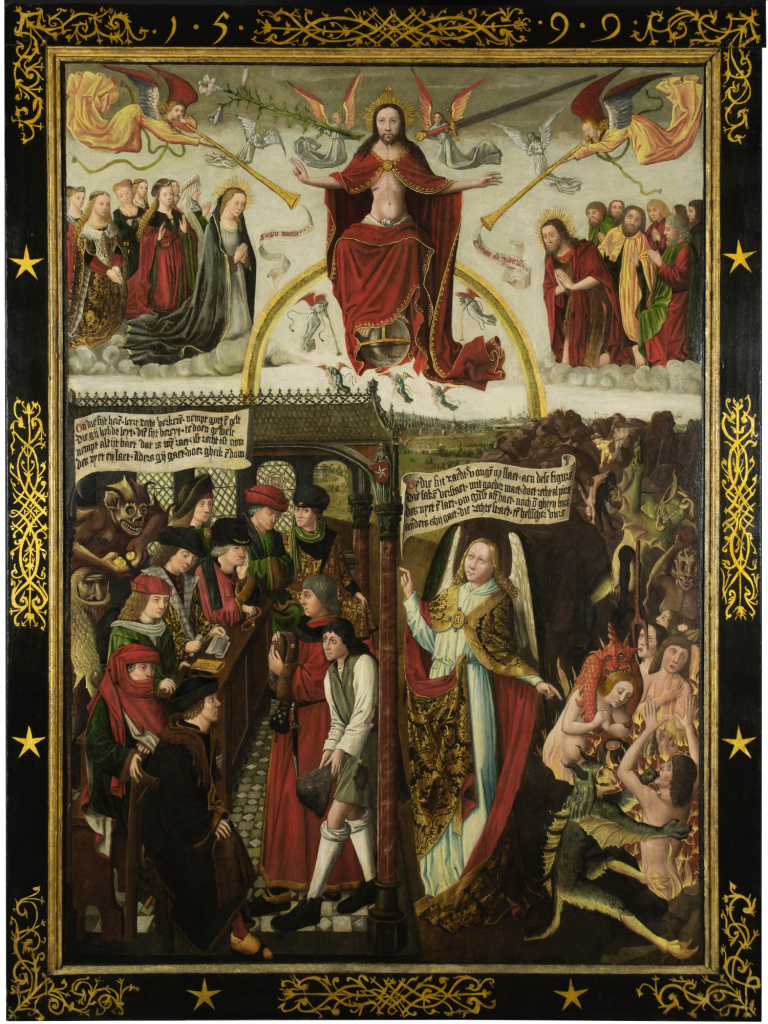 In the late Middle Ages, courtrooms were often decorated with paintings that reminded judges of their duty: dispense justice honestly. The impressive Justice Panel (c. 1475–1477), created by Jan van Brussel, once hung in the council chamber of Maastricht. At the top you see the Last Judgement: Christ as judge on a golden rainbow, surrounded by angels awakening the dead. Below, a court hearing unfolds: a rich man and a poor man face each other, while a devil attempts to bribe the judges. The Archangel Michael points sternly towards hell—a clear warning to those who give in to temptation.