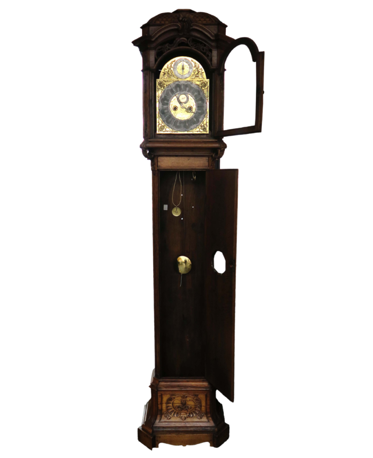 Grandfather clock made by Maastricht clockmaker François de Beefe, between 1750 and 1775. The dial of the clock is made from pewter and copper, the case from oak wood.